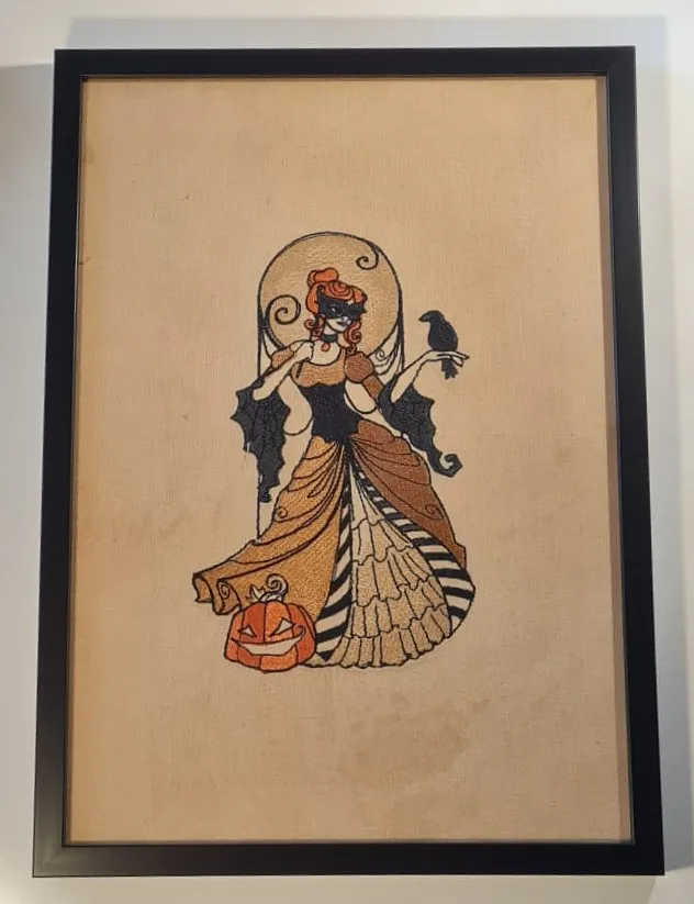 Een leuk geborduurd schilderijtje met vintage look. Het lijstje is groter maar de geborduurde dame is even groot als in de kleine lijst.